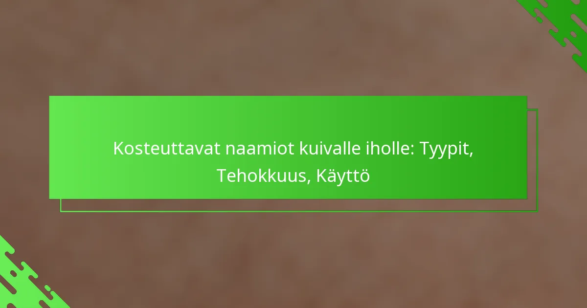 Kosteuttavat naamiot kuivalle iholle ovat erikoistuneita ihonhoitotuotteita, jotka on suunniteltu tarjoamaan intensiivistä kosteutusta ja ravintoa. Ne ovat saatavilla eri muodoissa, kuten kangasnaamioina, voinameina, geelinä ja yönaamioina, ja ne kohdistuvat kuivumiseen sekä parantavat ihon rakennetta. Parhaiden tulosten saavuttamiseksi on tärkeää puhdistaa iho ennen käyttöä ja noudattaa suositeltua aikaa kunkin naamion tyypin kohdalla.